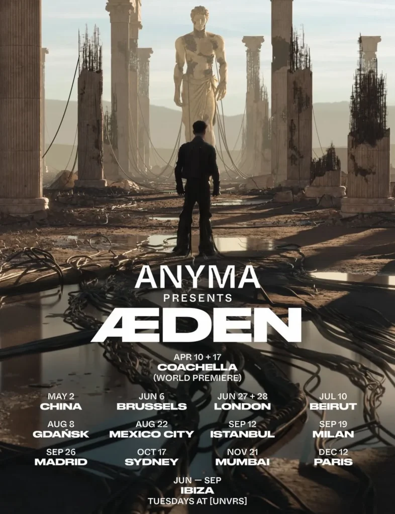 Además de la gira global, Anyma anunciará una residencia de verano 2026 en [UNVRS] Ibiza, donde presentará ÆDEN cada martes desde junio hasta septiembre. Este club, considerado un “hyperclub” por su fusión de espacio grande y experiencia íntima, se convertirá en uno de los epicentros del proyecto durante la temporada europea de música electrónica.
